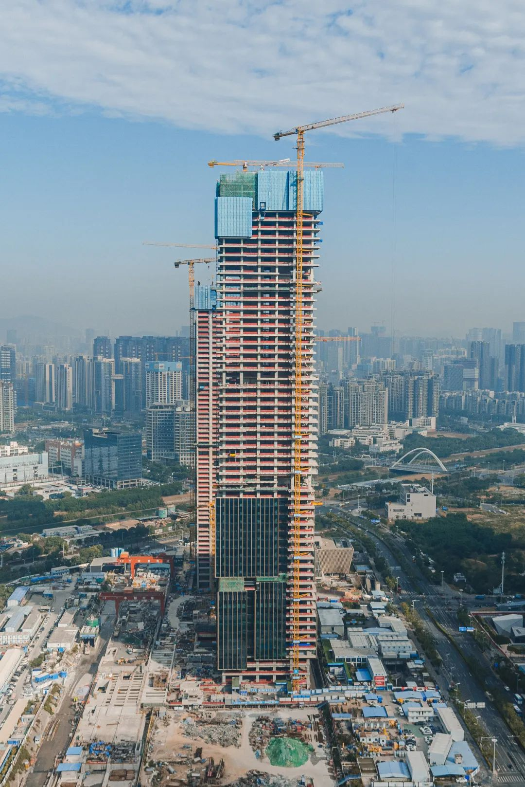 該項目位于南山區深圳灣超級總部基地,占地面積為3.6萬平方米,將建設成集辦公、商業、酒店、文化、交通于一體的超高層雙塔地標TOD綜合體。項目采用裝配式鋼結構技術快速建造,綜合應用多項智能建造創新技術。如基于BIM-nD理念的數字化管理平臺,實現建造過程關鍵數據實時映射和追溯;超高層智能頂升平臺,集成多款智能機器人和裝備,形成流水線式高效建造模式;實行數字化交付,為今后智慧運維管理平臺建立“數據底座”。