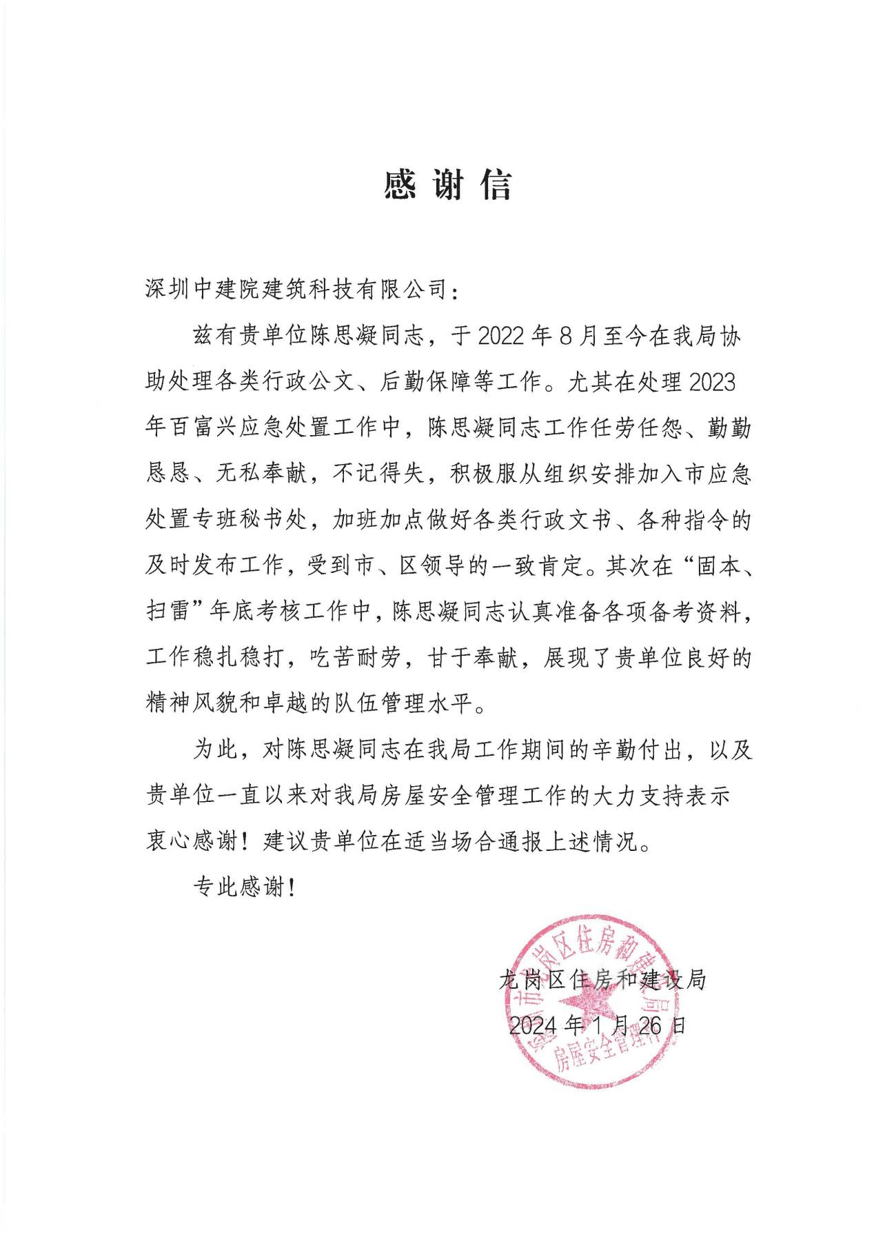 信中強(qiáng)調(diào),深圳中建院駐點代表陳思凝同志以吃苦耐勞、不計得失的良好精神,協(xié)助處理各類行政公文、后勤保障等工作,積極服從組織安排加入市應(yīng)急處置專班秘書處,工作期間的表現(xiàn)也受到市、區(qū)領(lǐng)導(dǎo)的一致肯定。