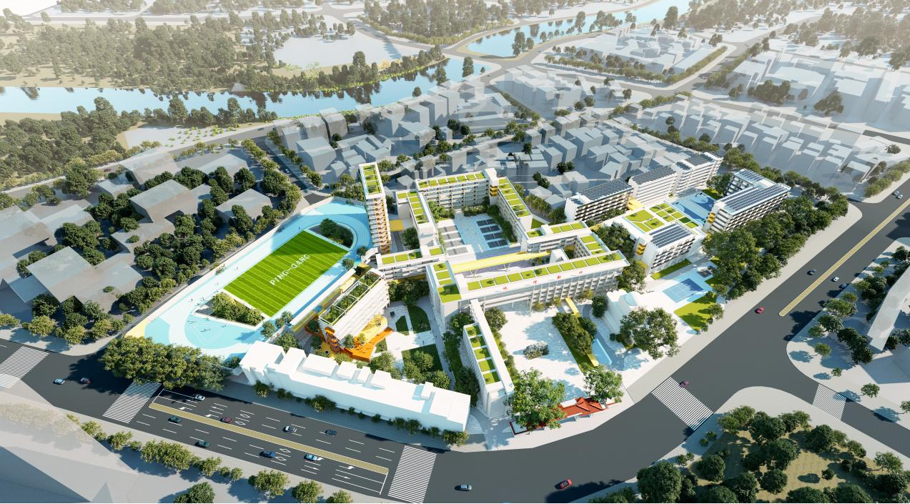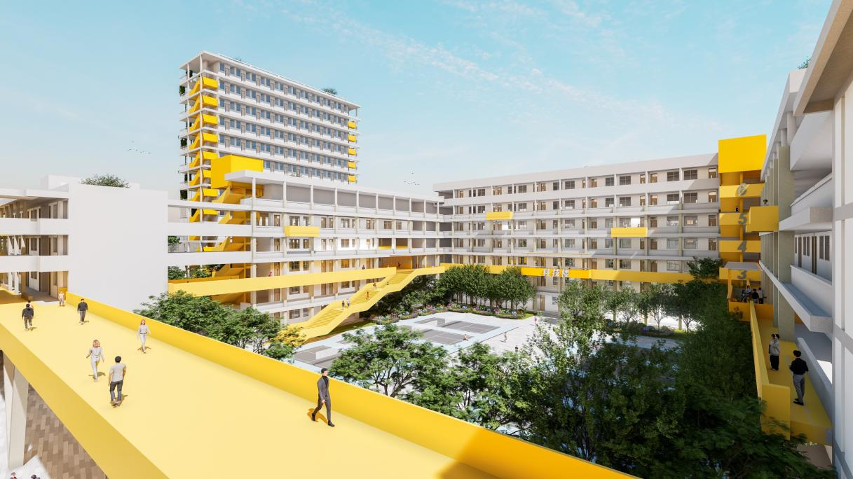 因地處龍崗區“客韻新城”,毗鄰龍崗河、龍園公園和鶴湖新居客家民俗博物館,周邊交通發達,生活便利,人口聚集,校園內綠樹成蔭、設施齊全,擁有良好的打造“綠色校園”“文化校園”的基礎。項目組立足校園現狀,通過安全評估、院落織補、空間滲透、連橋搭建等設計手法打造多元一體化校園,建成后將為龍崗區師生提供一個安全高效、活力創新的高品質學校。