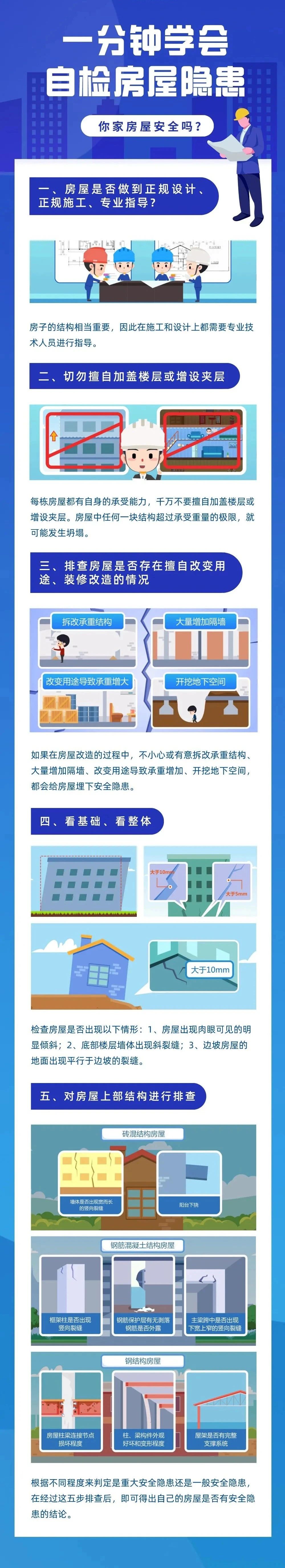房屋是日常生產(chǎn)生活的重要場(chǎng)所,房屋安全與大家生活品質(zhì)息息相關(guān)。房屋像人一樣,會(huì)經(jīng)歷“生、老、病、死”,從出生到死亡,有病要治病,沒(méi)病要體檢。平時(shí)會(huì)出現(xiàn)一些“病害”,如果沒(méi)有及時(shí)發(fā)現(xiàn)、早日醫(yī)治,慢慢會(huì)演變成傾斜、折斷、坍塌等“重癥”乃至“死亡”。關(guān)于房屋安全,這些知識(shí)您要及早了解。