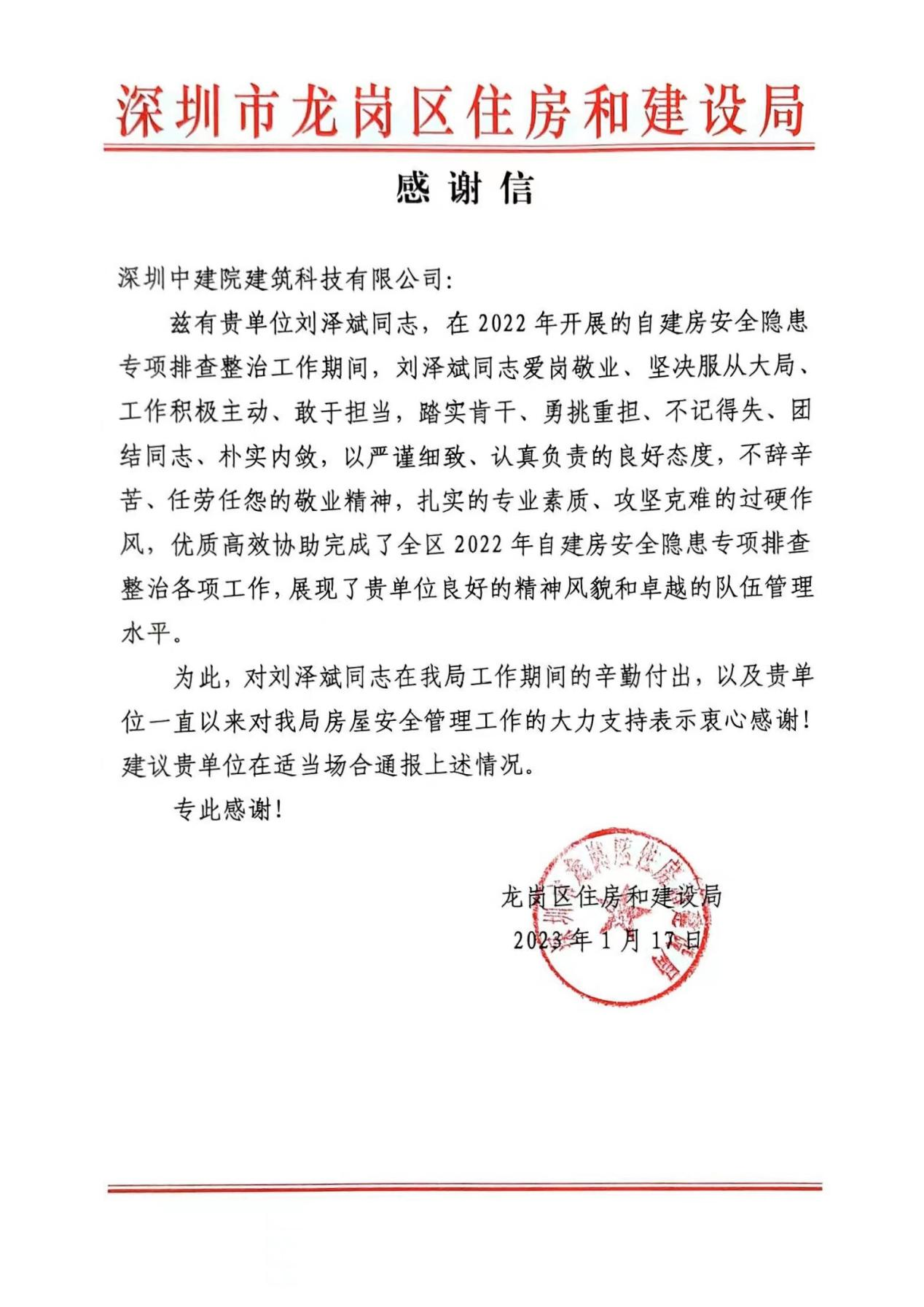 近期,深圳中建院建筑科技有限公司(以下簡稱“深圳中建院”)收到深圳市龍崗區(qū)住房和建設局發(fā)來的感謝信,對深圳中建院及劉澤斌同志在2022年度開展的自建房安全隱患專項排查整治工作中的辛勤付出和大力支持表示誠摯的謝意。