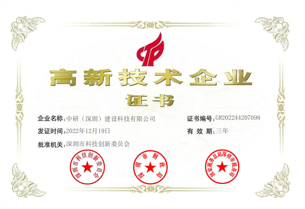 日前,中研(深圳)建設(shè)科技有限公司(下稱中研科技)順利通過評審,獲得了國家高新技術(shù)企業(yè)認(rèn)定證書(證書編號:GR202244207098),由此正式邁入國家高新技術(shù)企業(yè)行列,開啟新篇章。