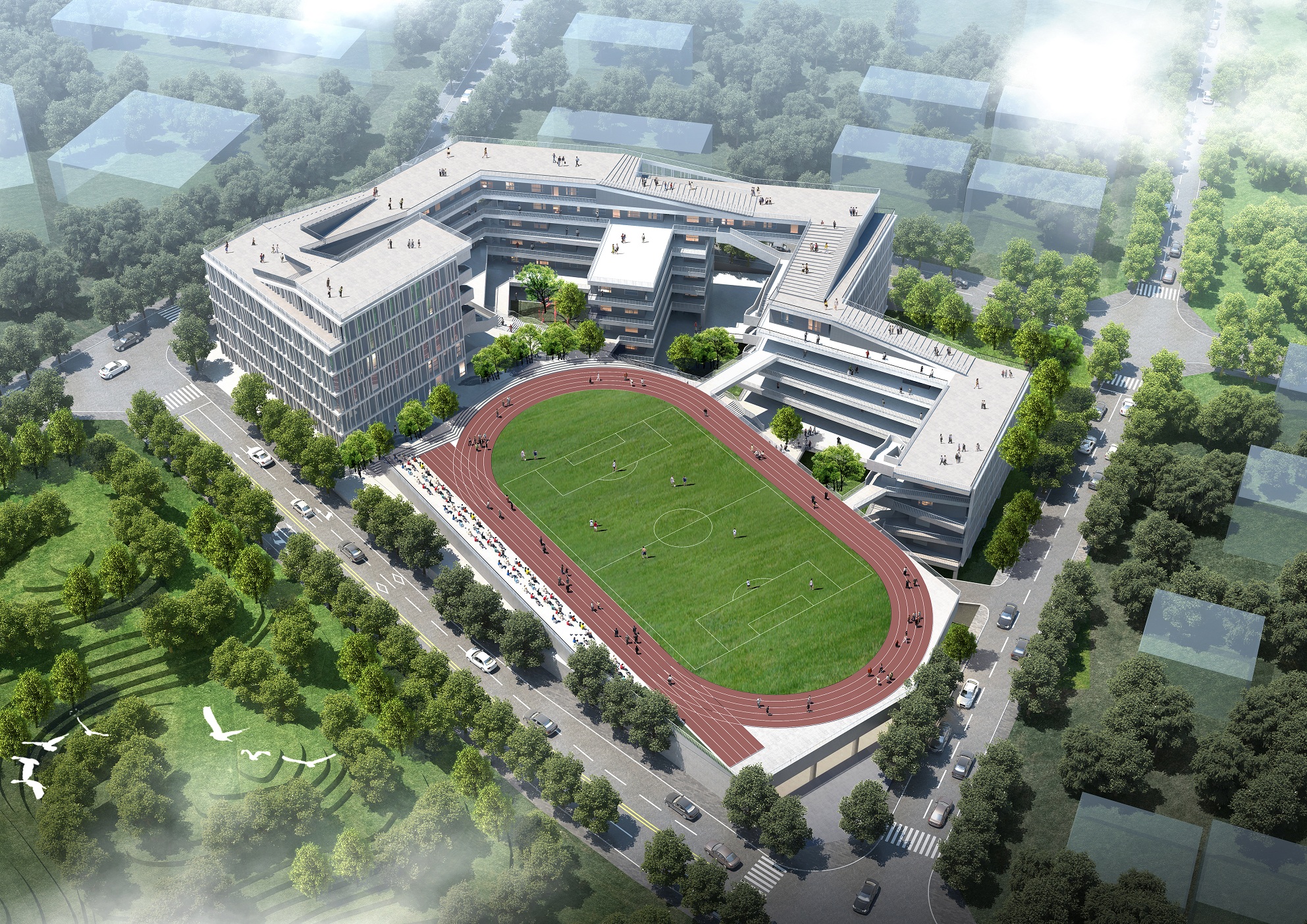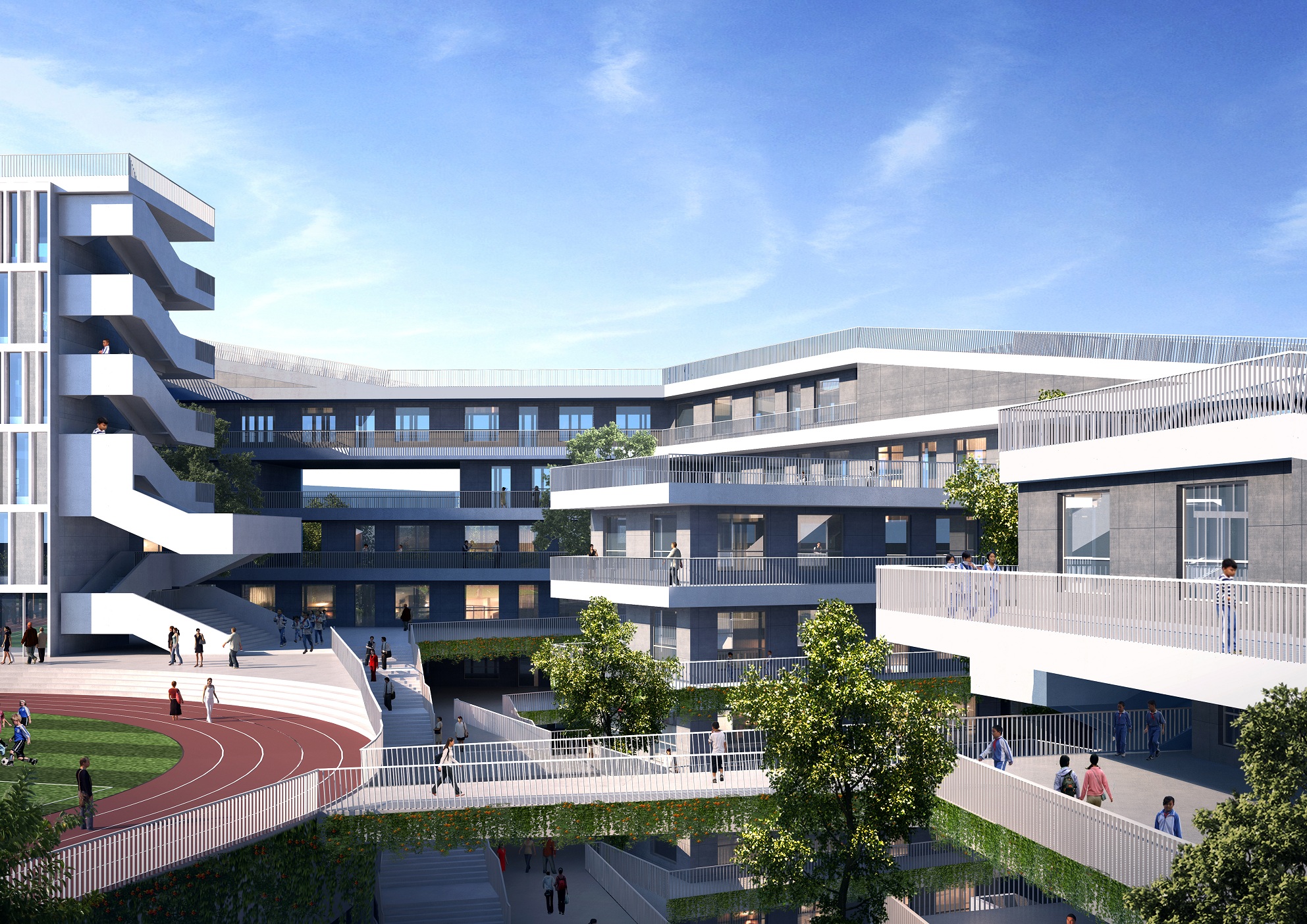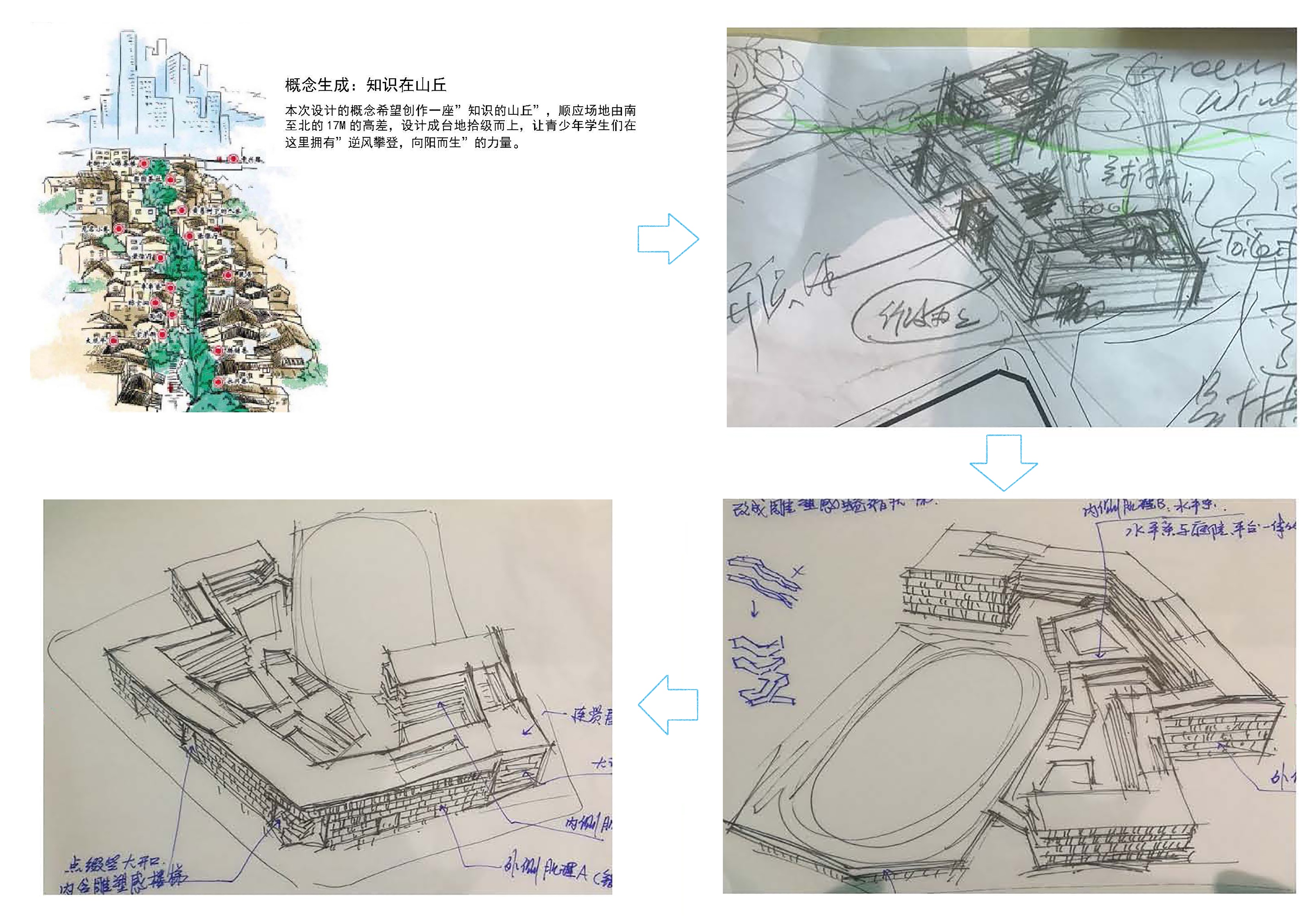 “書山有路勤為徑,學(xué)海無涯苦作舟”,求學(xué)之路道阻且難,每一位學(xué)子都須要傾其十余年心血,方能在學(xué)業(yè)上有所小成。我司深圳龍勝學(xué)校建筑方案以“知識的山丘”設(shè)計(jì)概念,將求學(xué)的攀登之路與項(xiàng)目的地形地貌相結(jié)合,為學(xué)校創(chuàng)作了一個(gè)寓理于景的立體式校園設(shè)計(jì)方案,以期展現(xiàn)莘莘學(xué)子勤勉求學(xué)的畫卷。