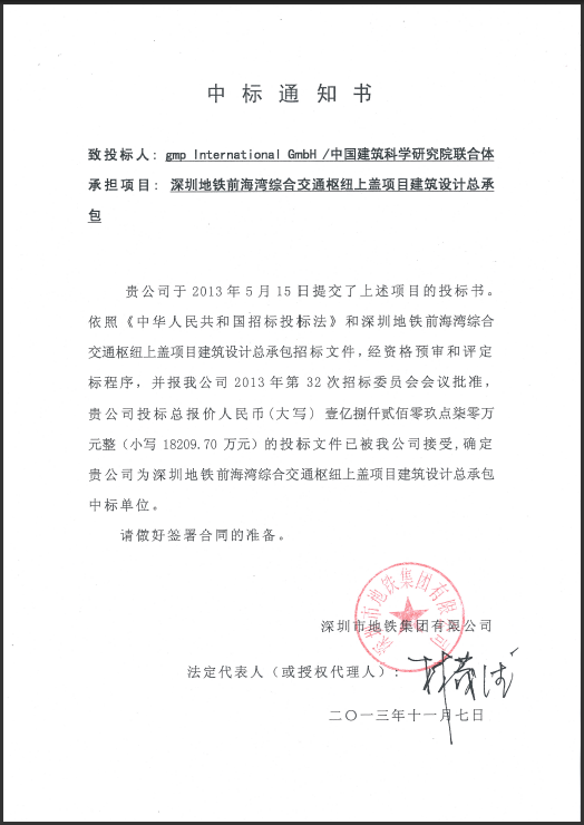 近日,我院與德國GMP國際建筑設(shè)計公司組成的設(shè)計聯(lián)合體收到了深圳市地鐵集團有限公司發(fā)來的關(guān)于深圳地鐵前海灣綜合交通樞紐上蓋項目建筑設(shè)計總承包的中標(biāo)通知書。