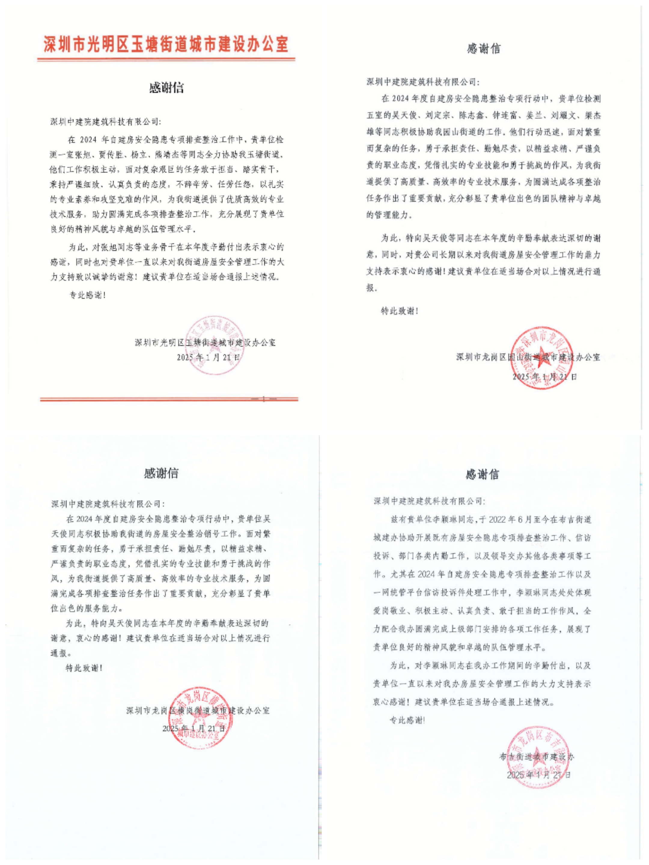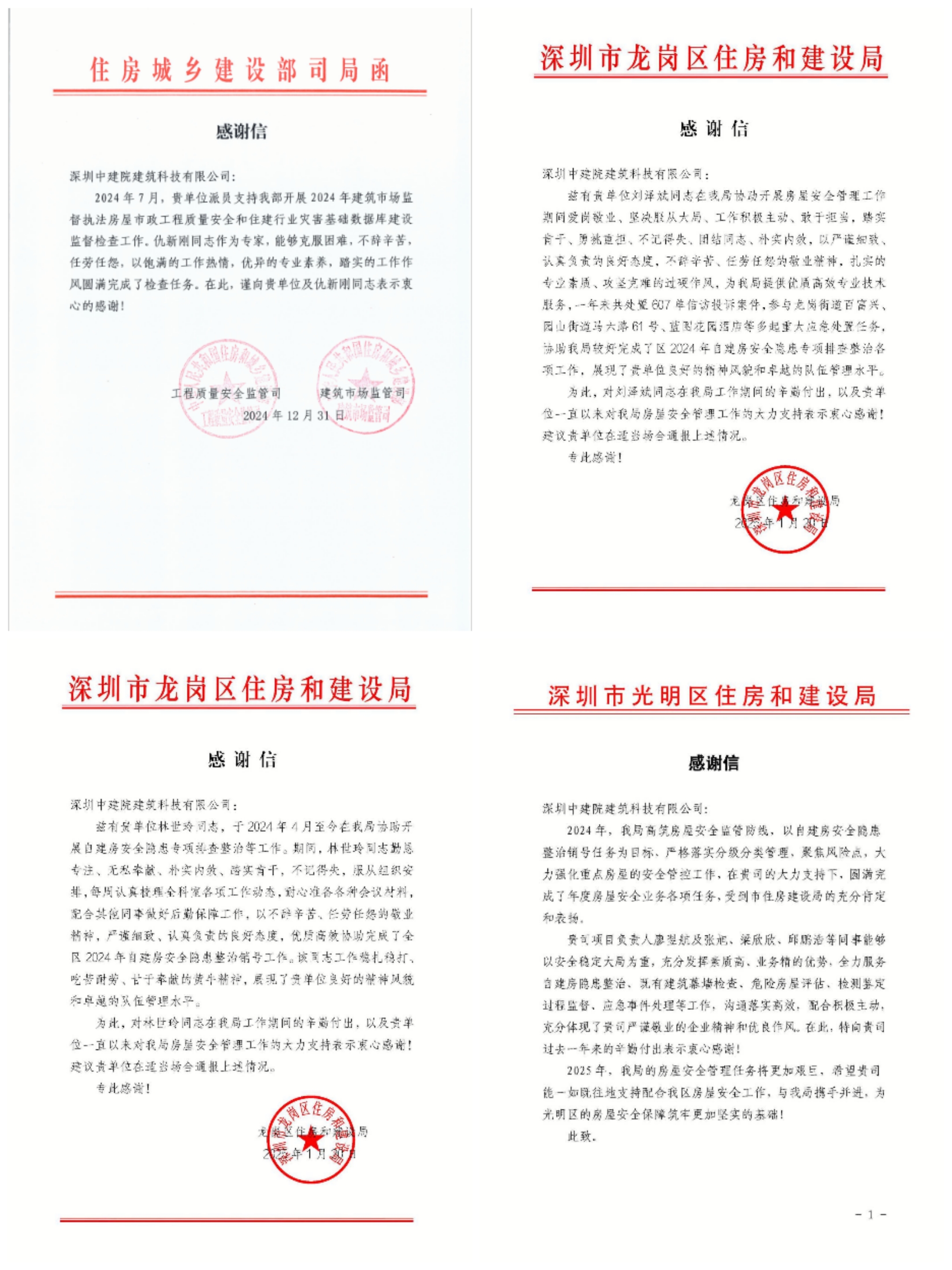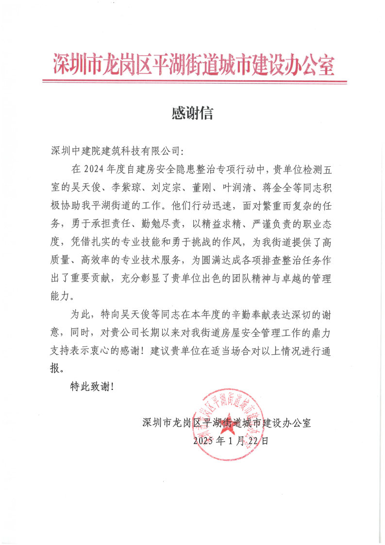 ?近日,中國建研院深圳分公司所屬深圳中建院陸續(xù)收到多封沉甸甸的感謝信——來自住房城鄉(xiāng)建設(shè)部工程質(zhì)量安全監(jiān)管司、建筑市場監(jiān)督司,深圳市光明區(qū)住房和建設(shè)局、龍崗區(qū)住房和建設(shè)局,及玉塘街道、園山街道、橫崗街道、布吉街道、平湖街道、新橋街道等政府部門。信中向深圳中建院在2024年建筑市場監(jiān)督執(zhí)法房屋市政工程質(zhì)量安全、住建行業(yè)災(zāi)害基礎(chǔ)數(shù)據(jù)庫建設(shè)監(jiān)督檢查工作中所作出的貢獻,以及多年來對深圳市區(qū)住建部門、街道等轄區(qū)主管部門在房屋安全管理工作的默默付出表示感謝。