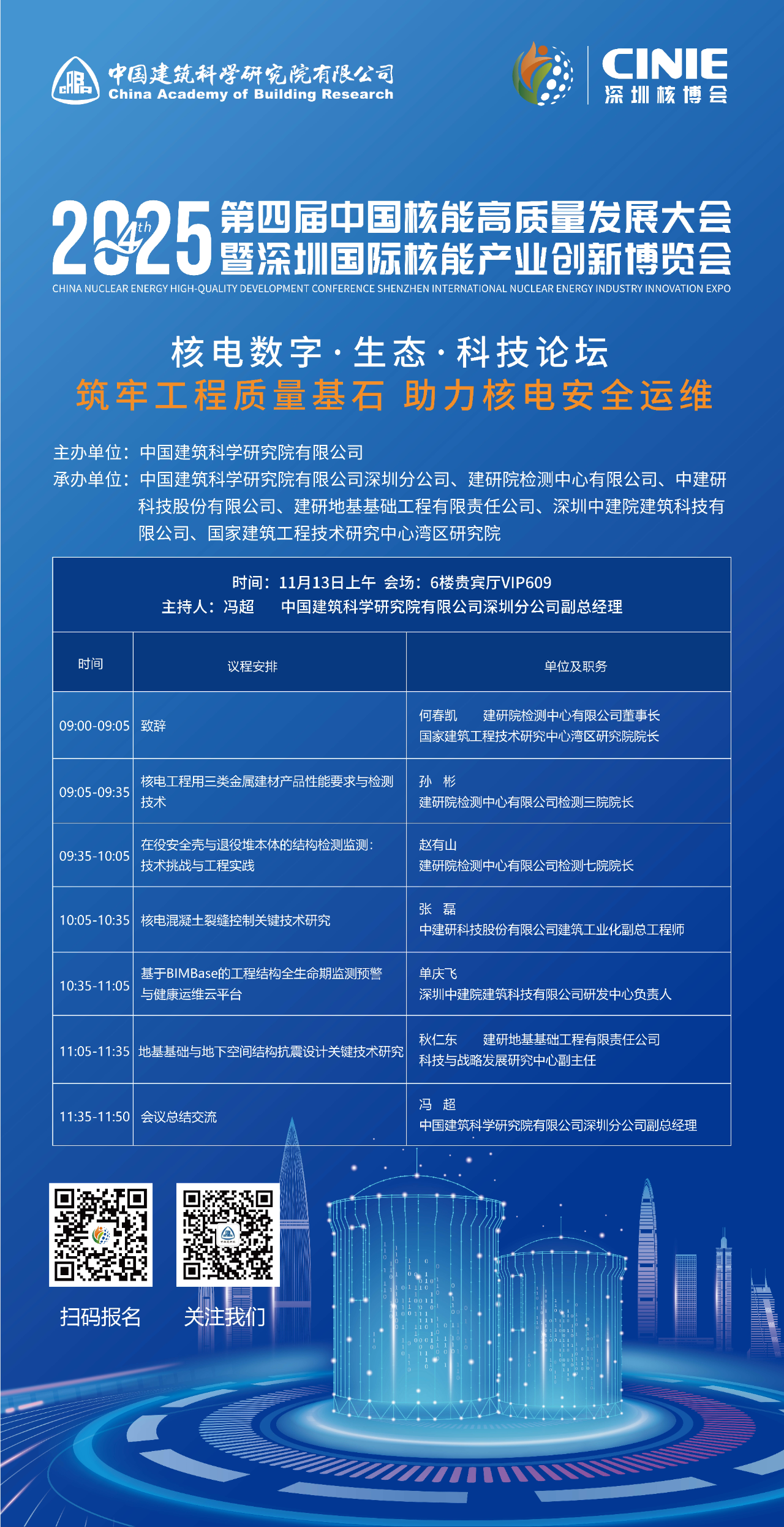 ?中國建研院作為工程建設領域的“國家隊”和科技創新的重要引領者,積極投身核電產業建設,深度參與國家多項重大核電工程。本屆大會期間,中國建研院將以“科技創新 賦能核電高質量發展”為主題組織“核電數字·生態·科技論壇”三場專題分論壇并設置展區,全面展示在核電領域的技術成果與實踐經驗,為推動構建新型能源體系、保障國家能源安全注入強勁的“核”動力。中國建研院深圳分公司聯合相關單位以“筑牢工程質量基石 助力核電安全運維”為專題承辦工程質量與運維專題分論壇。