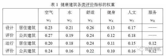 3.2.7條規定了《標準》中各評價指標的權重。《標準》在各指標權重研究中,以“抓主因、顧次因”的原則充分考慮了不同類型的民用建筑的健康影響因素,并按照民用建筑的分類,建立了居住建筑和公共建筑指標權重的調研問卷,采用問卷調查、層次分析、專家咨詢、項目試評等多途徑結合的方式,建立了健康建筑各類評價指標的權重,見表1