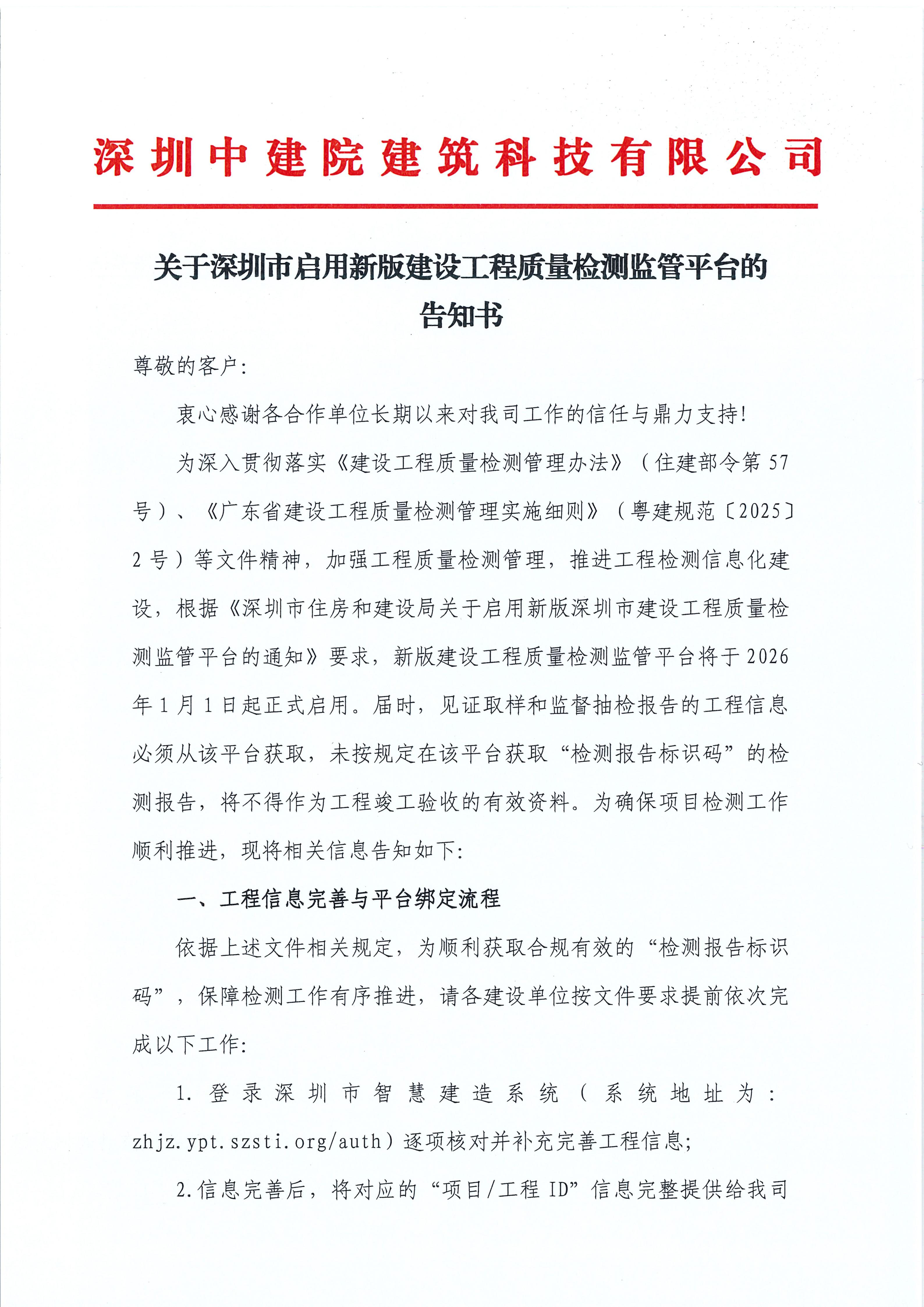 關于深圳市啟用新版建設工程質量檢測監管平臺的告知書